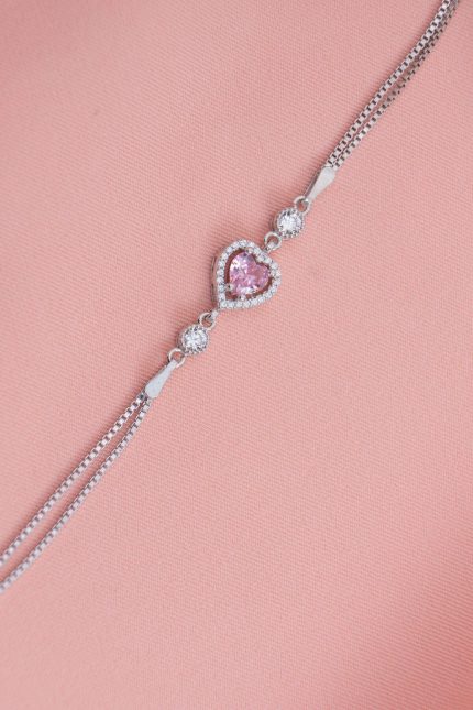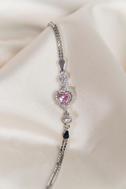 Pembe Zirkon Taşlı Kalpli Model Bileklik 925 Ayar Gümüş Bileklik