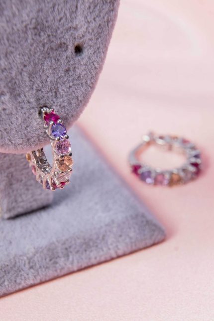 925 Ayar Gümüş Bombeli Halka Küpe Renkli Taşlı Halka Küpe Silver