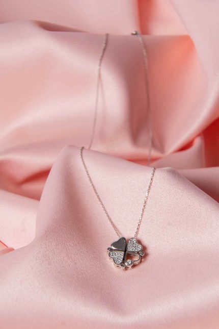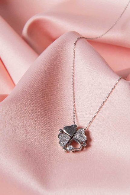Mıknatıslı Zirkon Taşlı Yonca Gümüş Kolye Silver Anti Alerjik 925 Ayar Gümüş