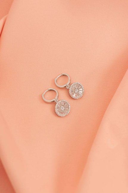 925 Ayar Gümüş Silver Halka Küpe Baget Taşlı Yuvarlak Sallantılı Küpe