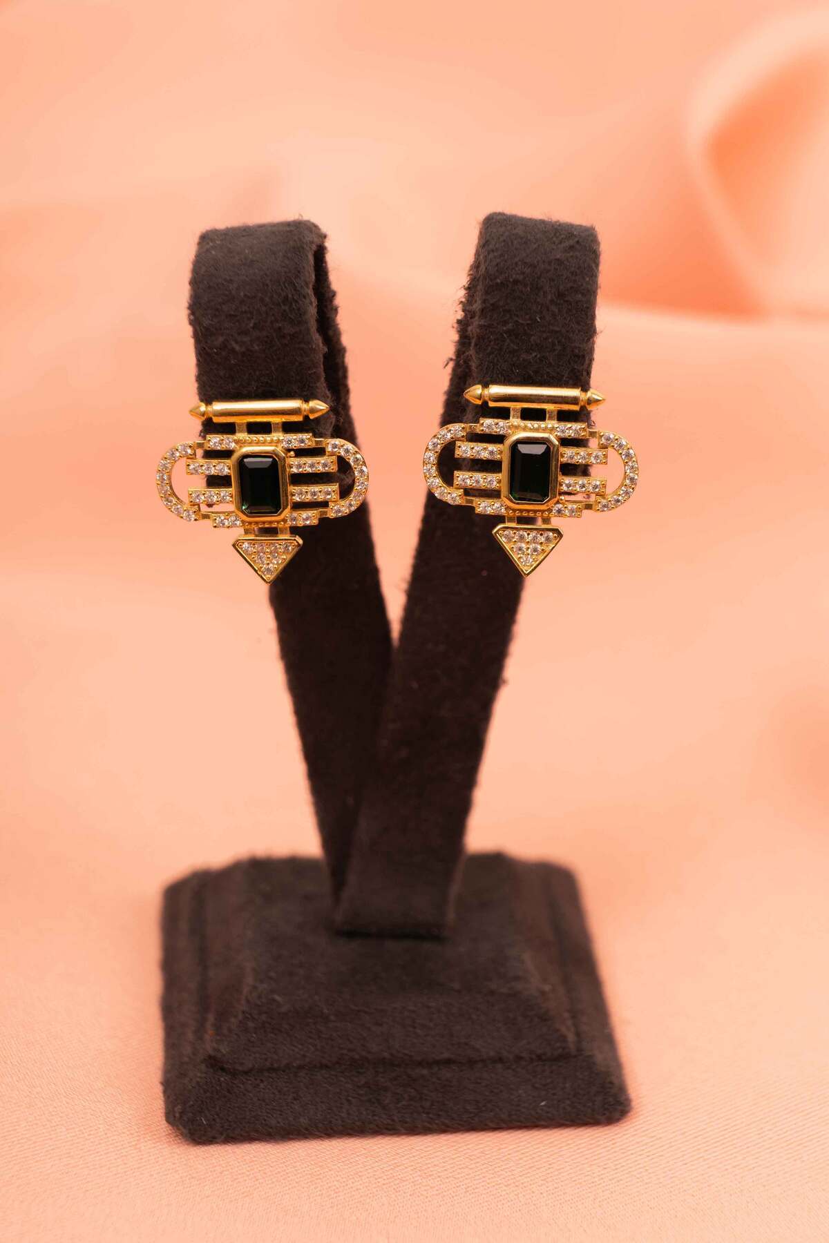 925 Ayar Gümüş Gold Kaplama Küpe Zirkon Taşlı Zümrüt Taş Detaylı Etnik Küpe