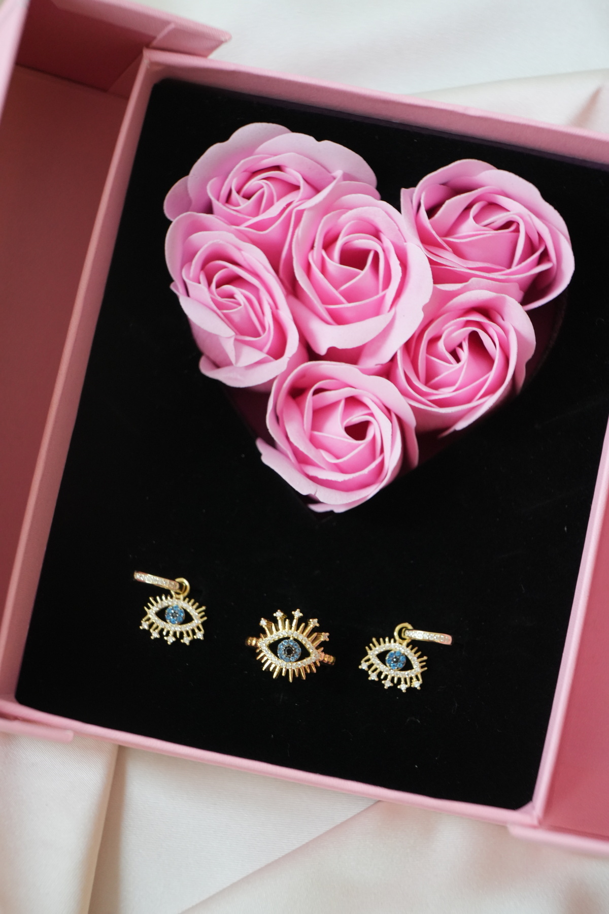 – 925 ayar gümüş malzeme ile üretilmiş, uzun ömürlü ve kaliteli bir aksesuar deneyimi sunar.; – Göz tasarımı ve mavi zirkon taş detayları ile dikkat çekici bir stil oluşturur.; – Kadın ve kızlar için özel olarak tasarlanmış, şık ve zarif bir aksesuar seçeneği sunar.; – Hem yüzük hem de küpe olarak kullanılabilecek set içeriğiyle, uyumlu ve tamamlayıcı bir görünüm sağlar.; – Yetişkinlerin zevkine hitap eden modern ve estetik bir tasarıma sahiptir.;