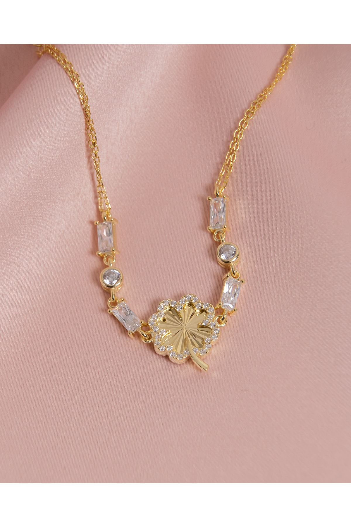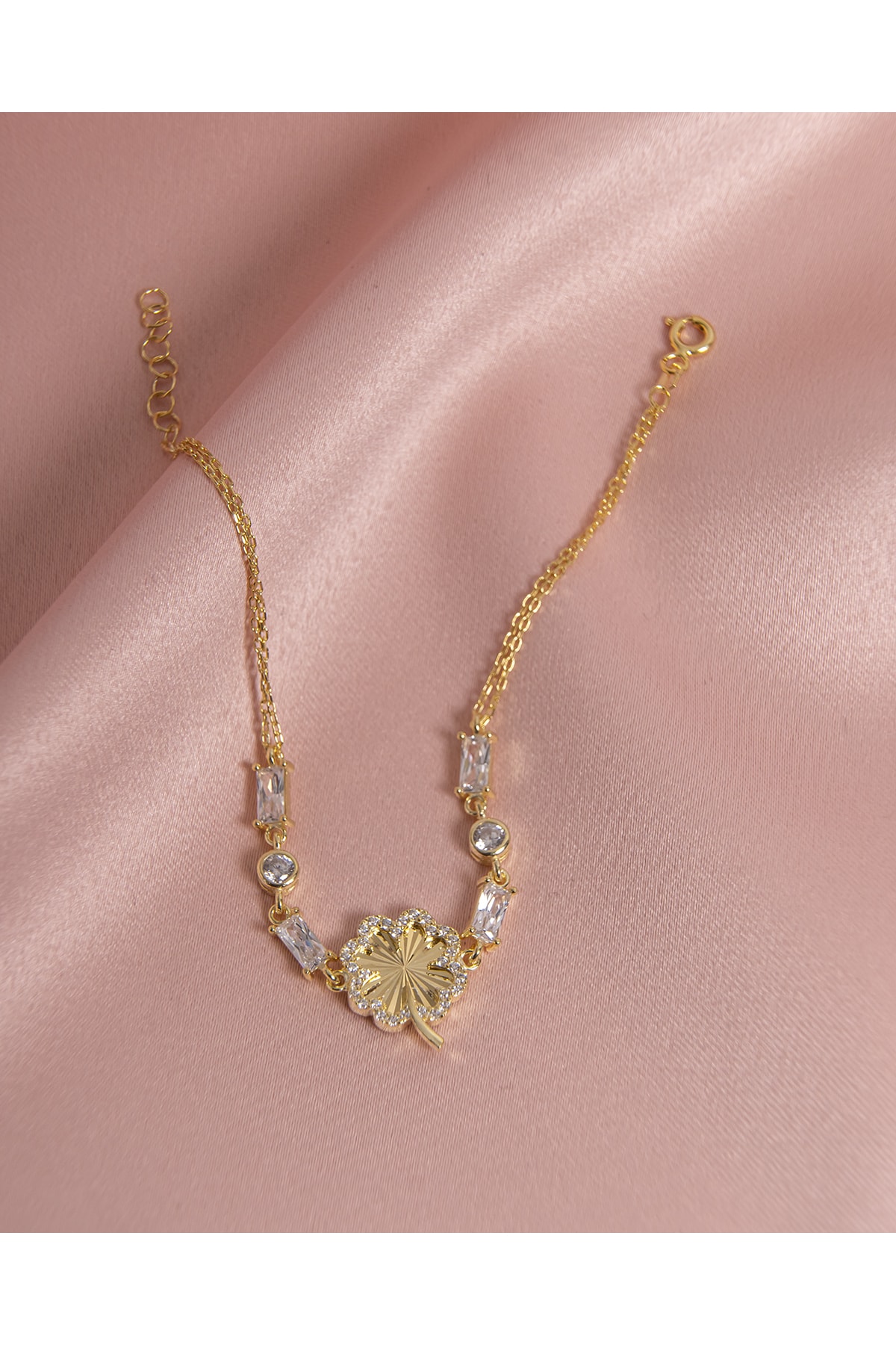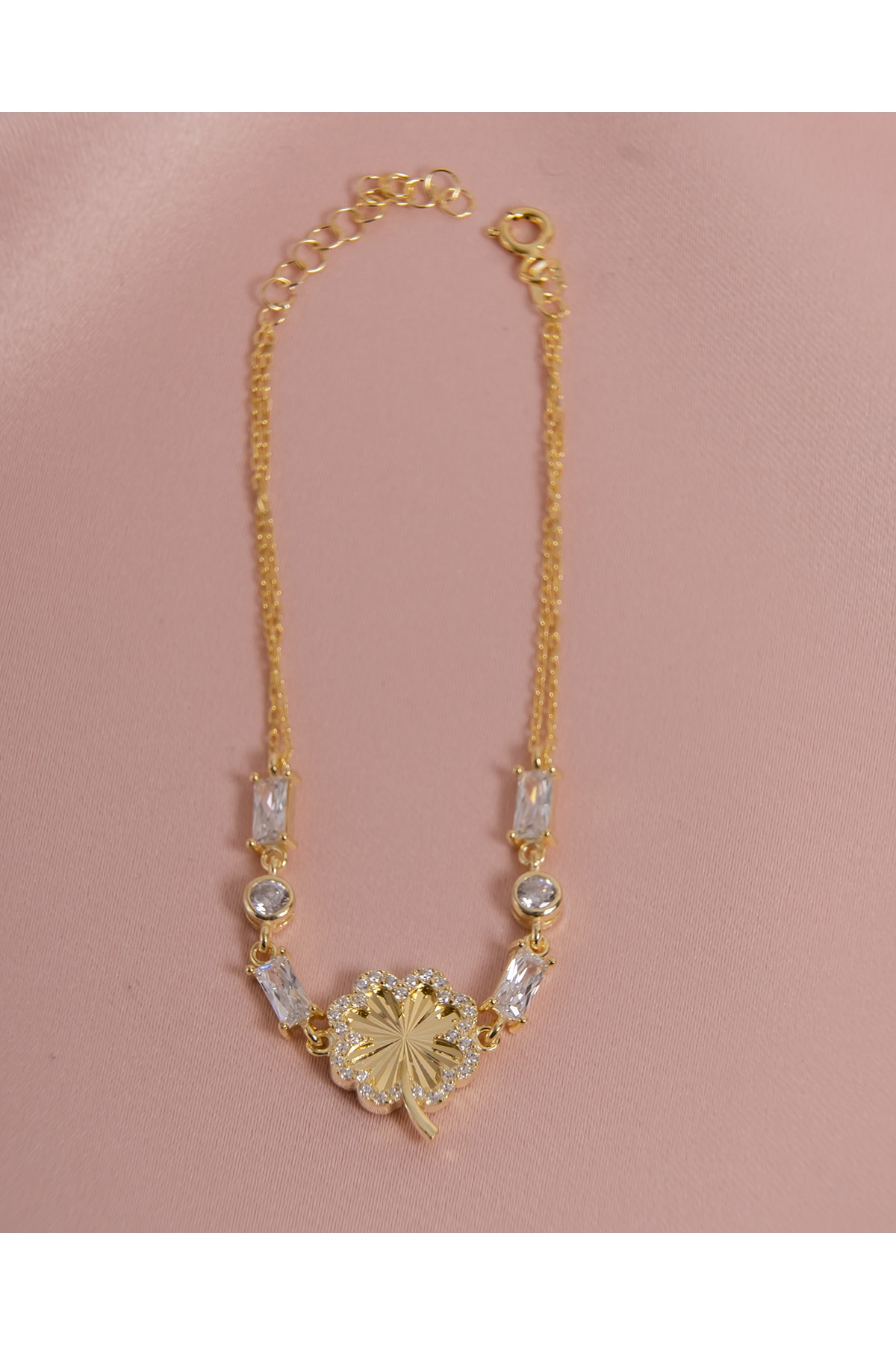 Baget Taşlı Yoncalı Bileklik Gold Kaplama 925 Ayar Gümüş