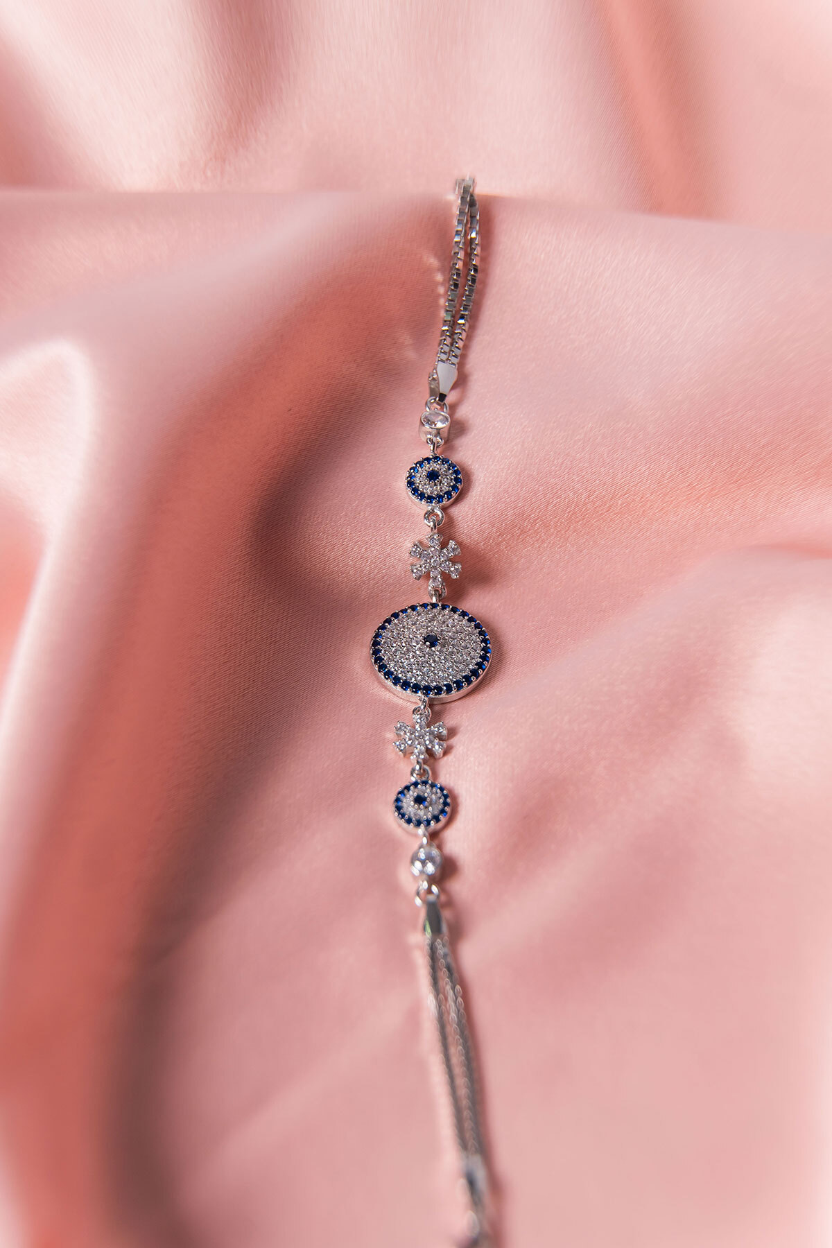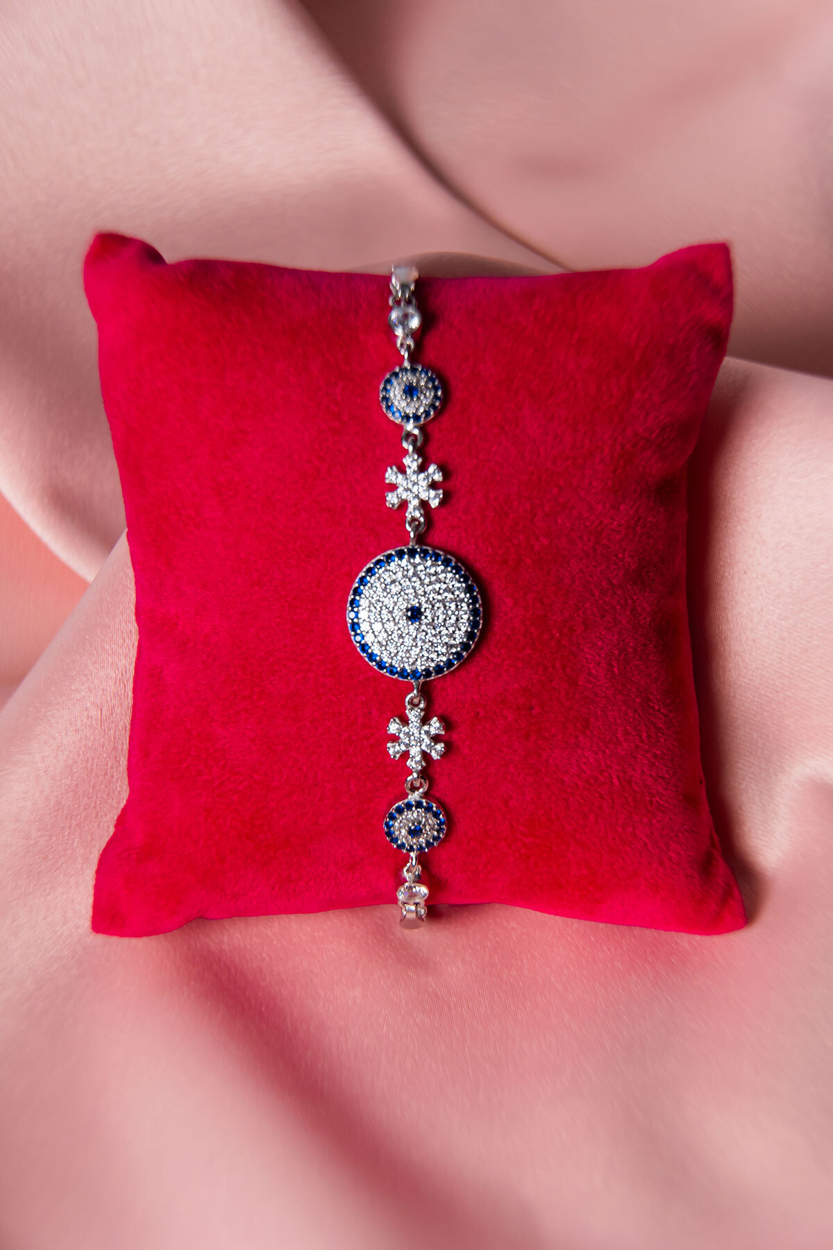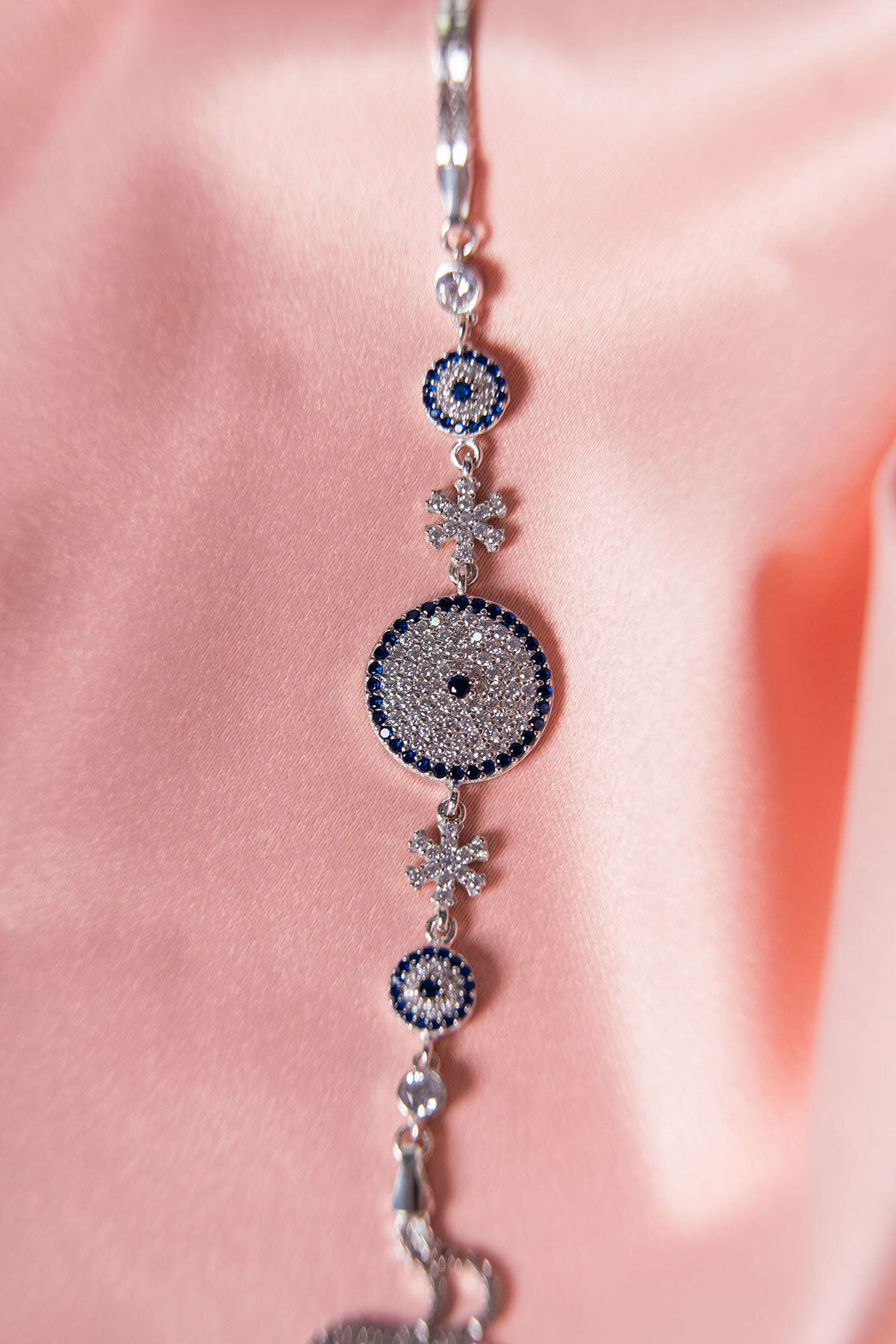 Kar Tanesi Detaylı Nazar Boncuklu Bileklik Silver 925 Ayar Gümüş