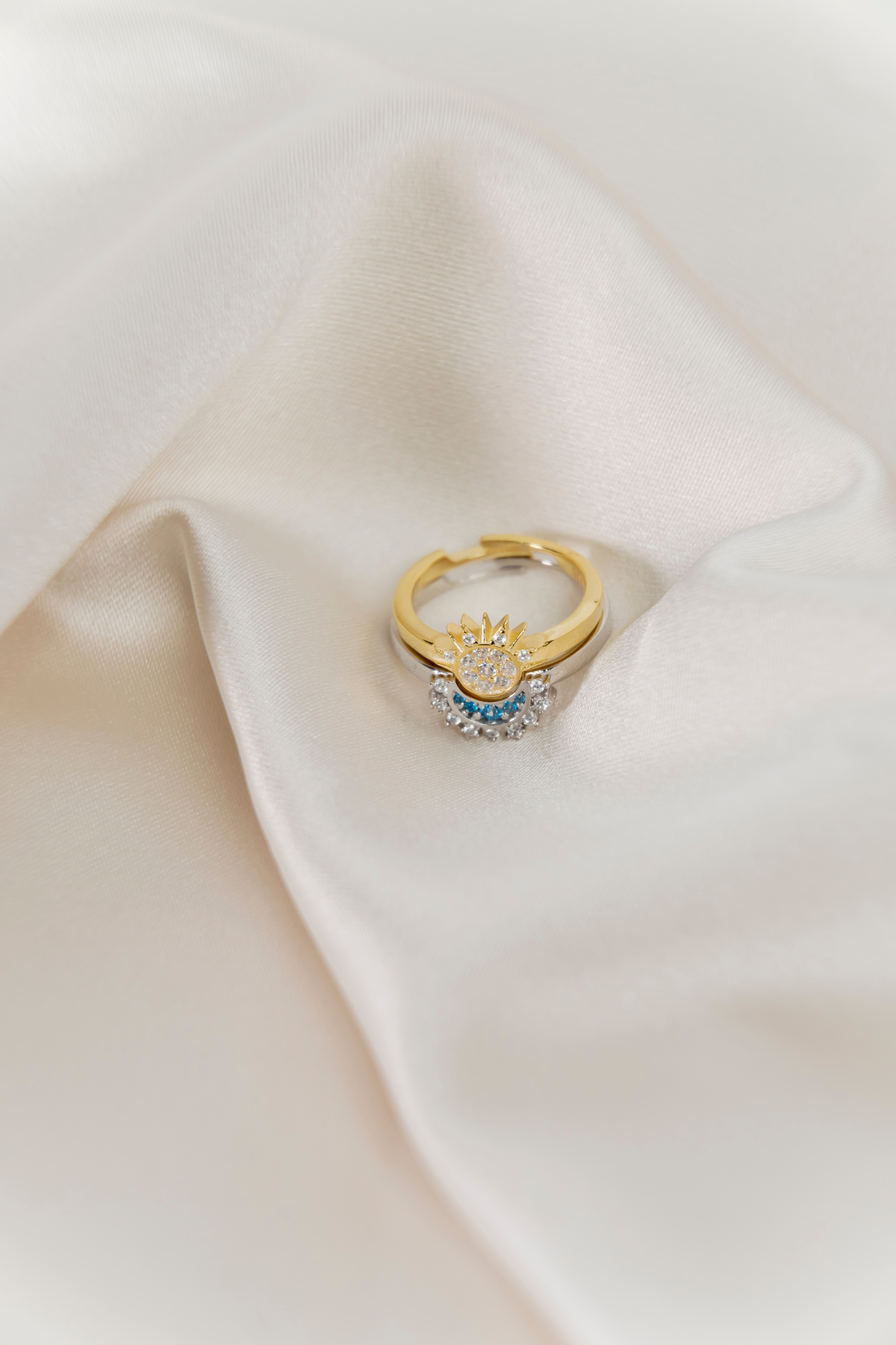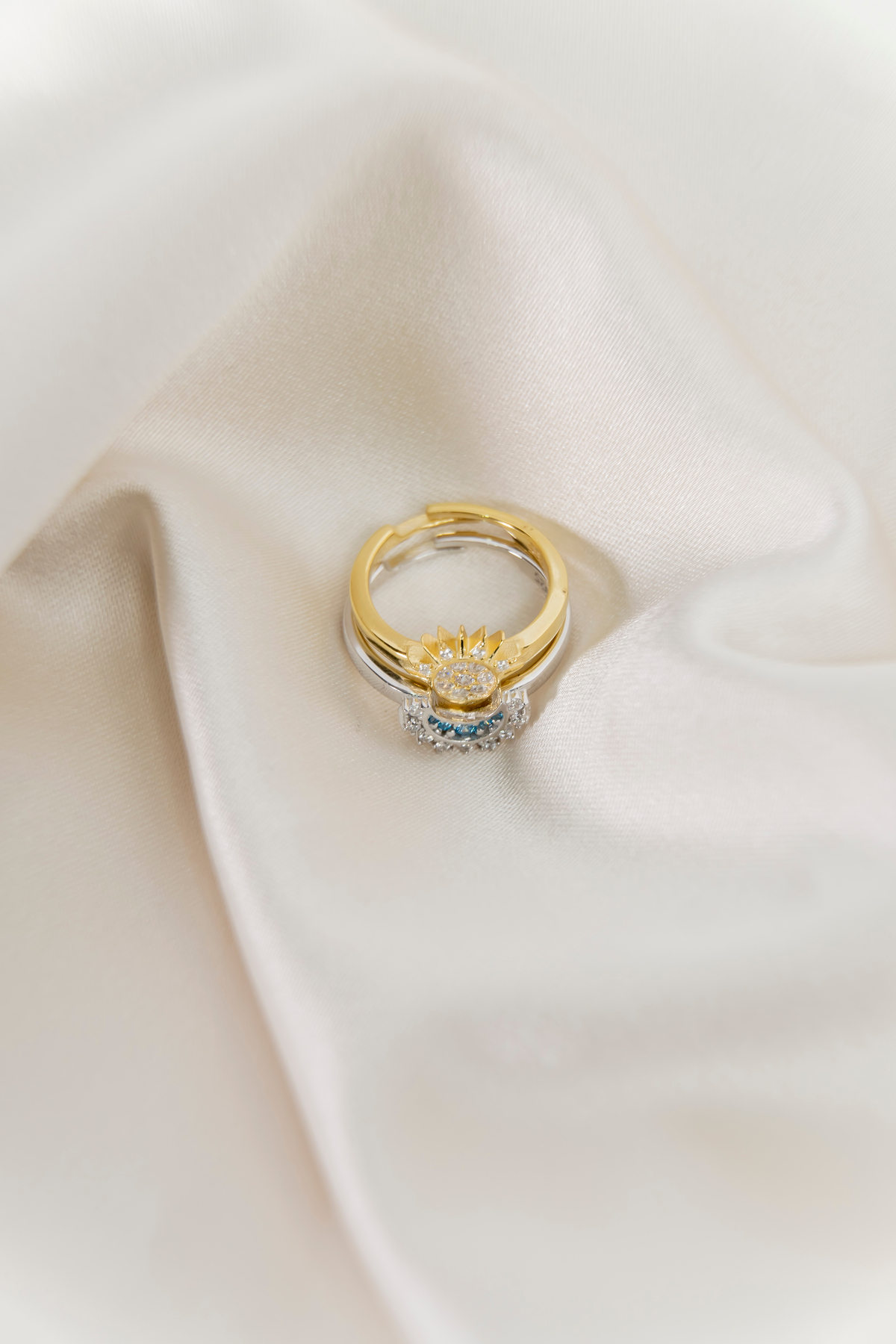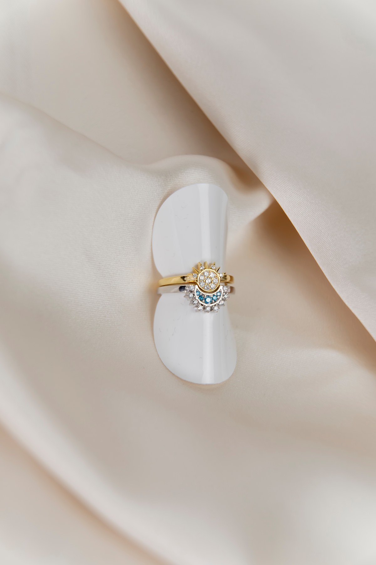 Zirkon Taşlı 925 Ayar Gümüş Yüzük, Güneş ve Ay detaylı Gümüş Yüzük, Gold Kaplama