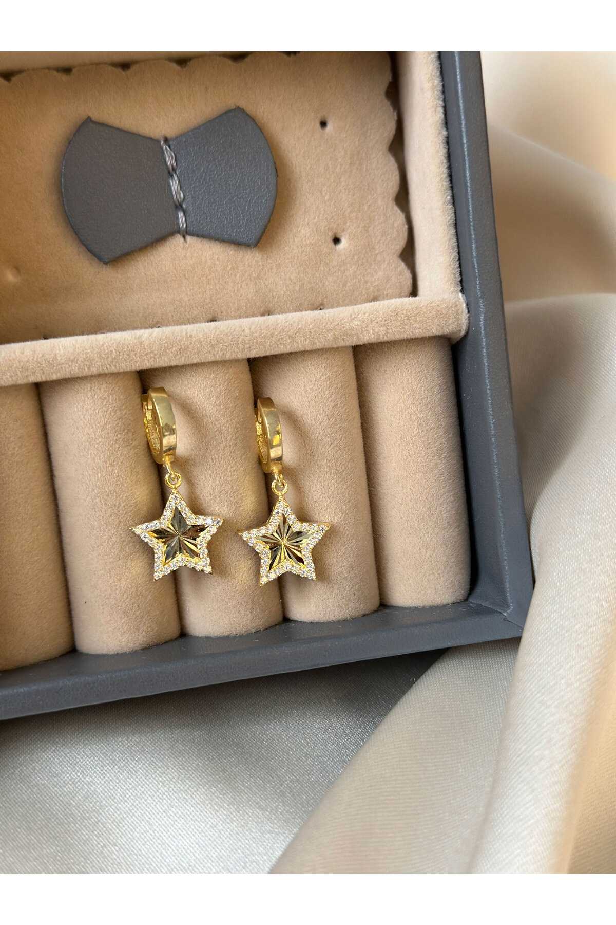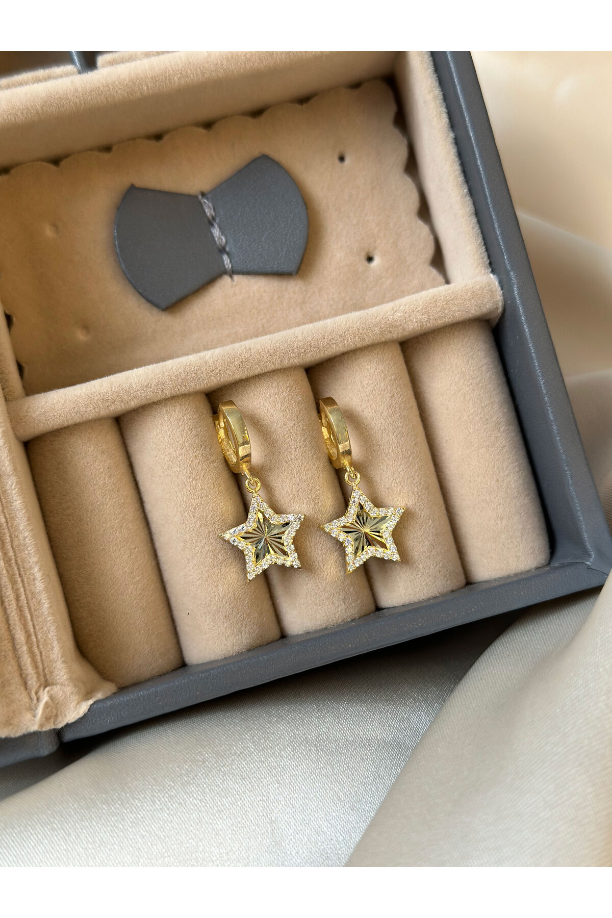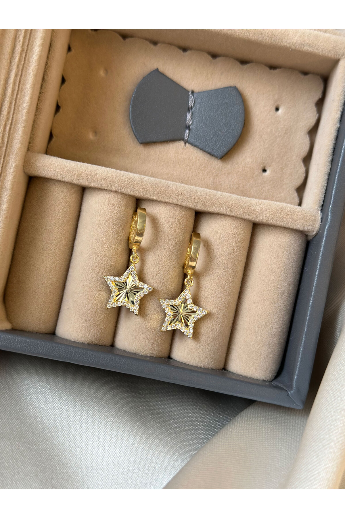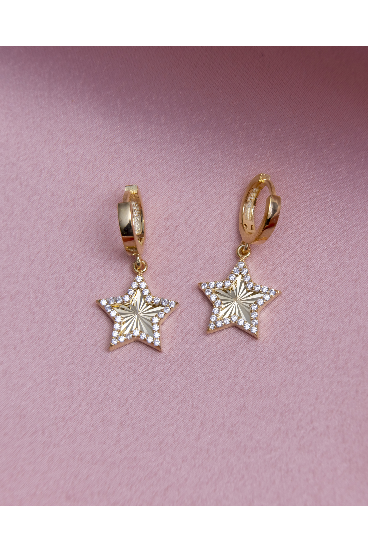 Zirkon Taşlı Sallantılı Işıltılı Yıldızlı Gümüş Küpe Gold Kaplama Anti Alerjik 925 Ayar Gümüş